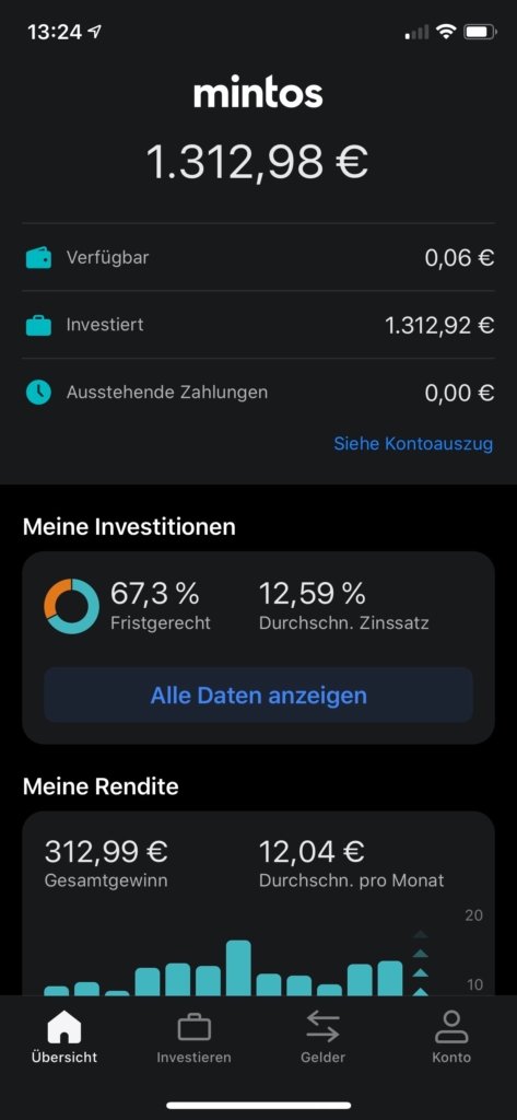 In den Screenshots der Mintos-App seht ihr meine aktuellen Investments bei Mintos. Ich habe im Juni 2017 mit 500€ angefangen und nach und nach bis zum Oktober 2018 auf 1000€ aufgestockt. Seitdem läuft das ganze mit einem Basisinvest von 1000€ schön vor sich hin. Und generiert eine Rendite von um die 12,5% p.a.